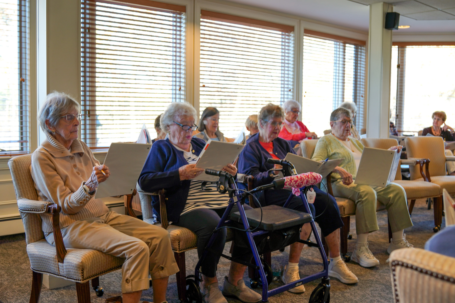 Our extensive activities calendar offers things that are both physically and cognitively stimulating. For example, we have balance class and chair yoga, in addition to word games and other games like BINGO and Rummikub that stimulate the brain. In Assisted Living both our activities coordinators and outside instructors have an awareness of which residents attend certain activities. That way, if someone appears to be late, the instructor will call their apartment to remind them and make sure everything is okay.