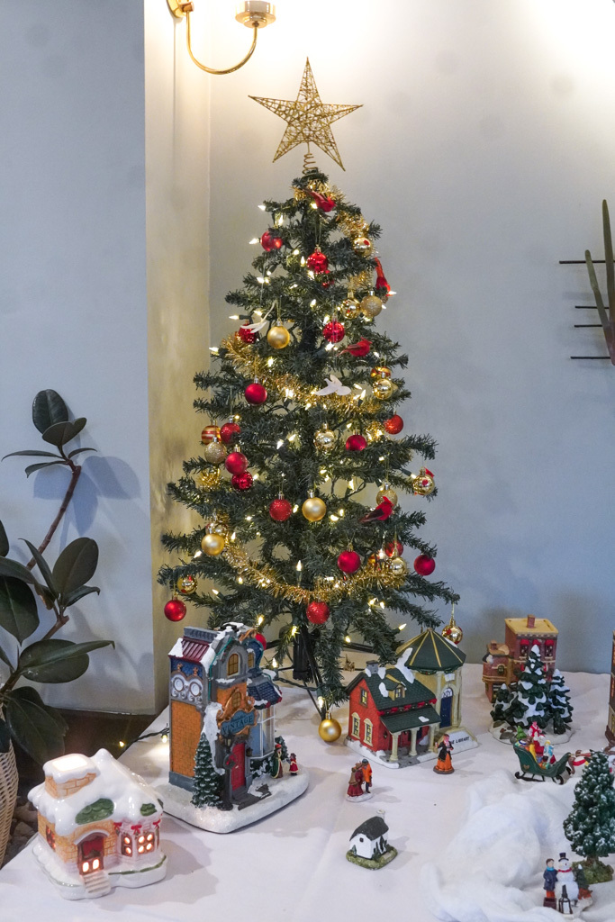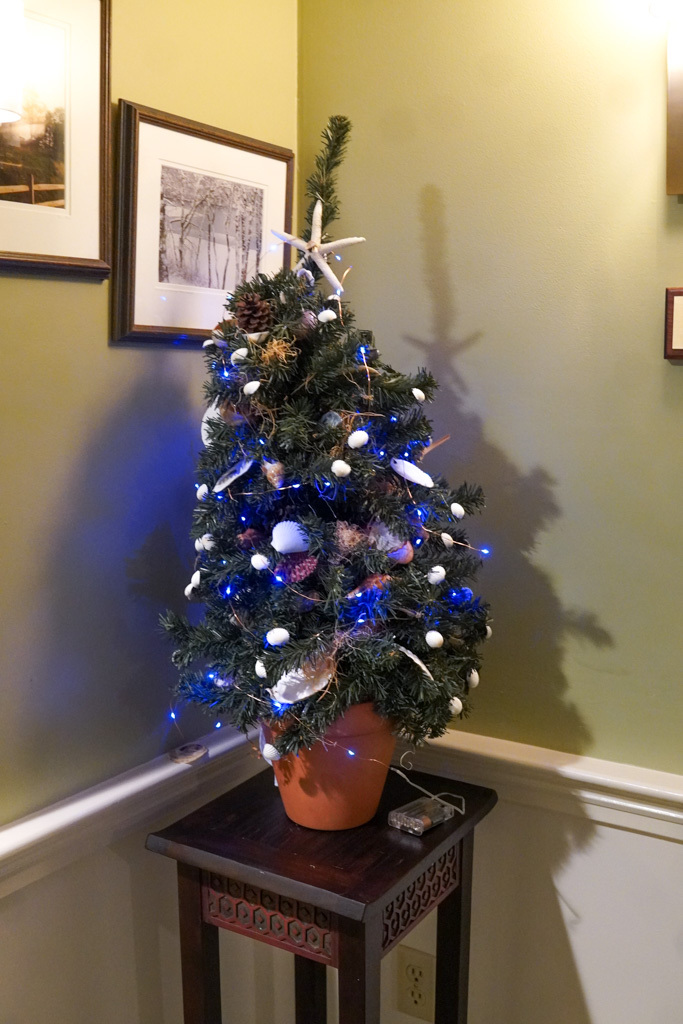 A decorated Christmas tree with red ornaments and delicate seashells stands in a cozy living room by large windows and a sofa.